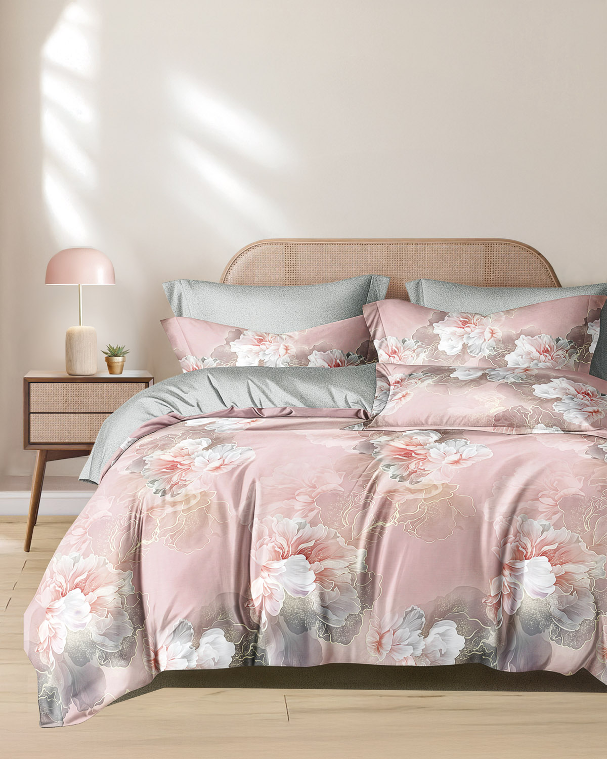 Ένα υπέρκομψο σετ υπέρδιπλων σεντονιών σε παστέλ αποχρώσεις που αποπνέει κομψότητα. Παστέλ ροζ με εντυπωσιακά λουλούδια στο πανωσέντονο και ανοιχτό γκρι το κατωσέντονο σίγουρα θα δώσει φρεσκάδα στο χώρο σας. Είναι κατασκευασμένα από 100% βαμβακοσατέν 200 κλωστών με νήματα πενιέ, που τα καθιστά εξαιρετικά μαλακά για να σας χαρίσουν τον τέλειο ύπνο, αλλά και ανθεκτικά και εύκολα στο σιδέρωμα. Η ποιότητα και το μοναδικό τους σχέδιο τους θα δώσουν στην κρεβατοκάμαρά σας ένα ξεχωριστό στυλ. Στο σετ περιλαμβάνονται και δύο μαξιλαροθήκες τύπου oxford διπλής όψης. *Το σχέδιο στις μαξιλαροθήκες ενδέχεται να διαφέρει από αυτό της φωτογραφίας, καθώς η εταιρεία παράγει μαξιλαροθήκες από όλο το σχέδιο του υφάσματος και τις συσκευάζει με τυχαία σειρά. ** Συνδυάστε τα με τα υπόλοιπα είδη του ιδίου σετ για ένα ολοκληρωμένο αποτέλεσμα. ΦΡΟΝΤΙΔΑ/ ΟΔΗΓΙΕΣ ΠΛΥΣΗΣ Πλύσιμο σε μέγιστη θερμοκρασία νερού 40C. Απαγορεύεται η χρήση λευκαντικών ουσιών ή χλωρίνης.
